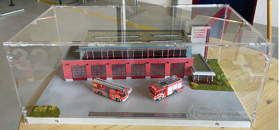 Mit einer Laudatio von Heiko Schroff, der bereits unter Dietmar Weber 20 Jahre als Stellvertreter tätig war, wurde Dietmar Webers Lebenswerk – untermalt mit diversen „Schnappschüssen“ aus den letzten 34 Jahren – gewürdigt. Als ganz besonderes Abschiedsgeschenk erhielt Dietmar Weber von seiner Abteilung, das was ihm in seiner ganzen Amtszeit besonders am Herzen lag – den Neubau des Feuerwehrhauses Weilimdorf – als Modell mit dem HLF 20 und der aktuellen Drehleiter der Abteilung. Zusätzlich erhielt er einen Gutschein für ein Abendprogramm bei der nächsten Städtereise.