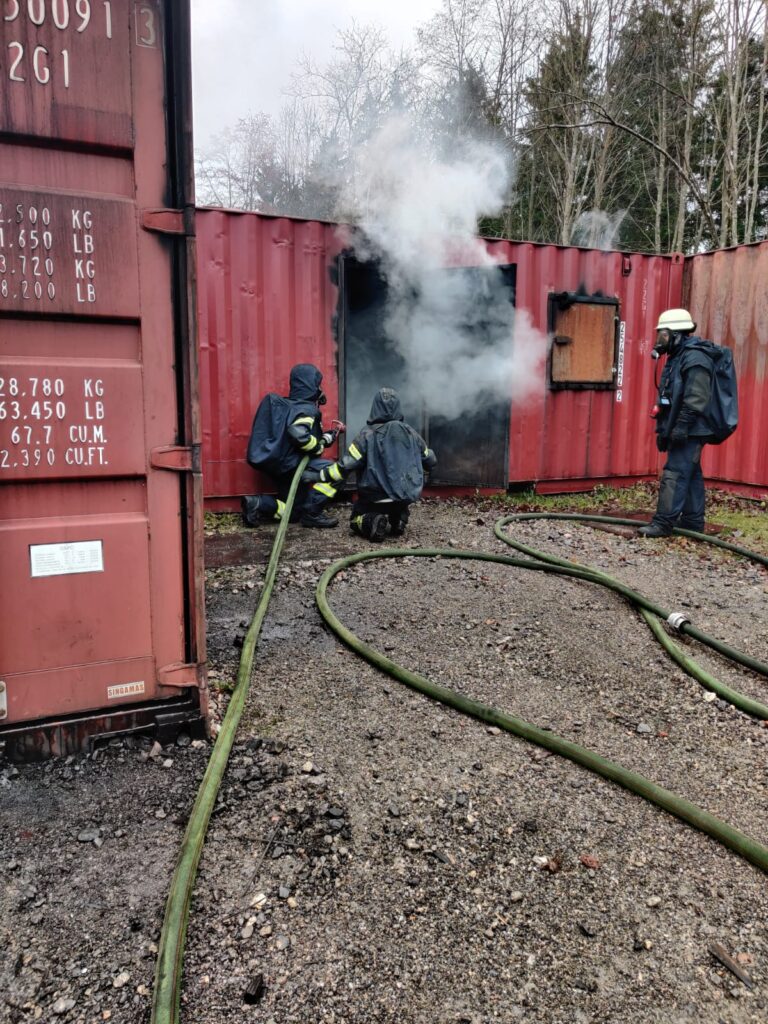 Nach einer theoretischen Einweisung ging es dann in die praktische Ausbildung an den holzbefeuerten Containern. Neben der beeindruckenden Vorführungen von verschiedenen Rauchbildern und deren Folgen und Auswirkungen, wurden auch in speziellen Einsatzübungen nach Vorgehen in verrauchten Objekten geübt.