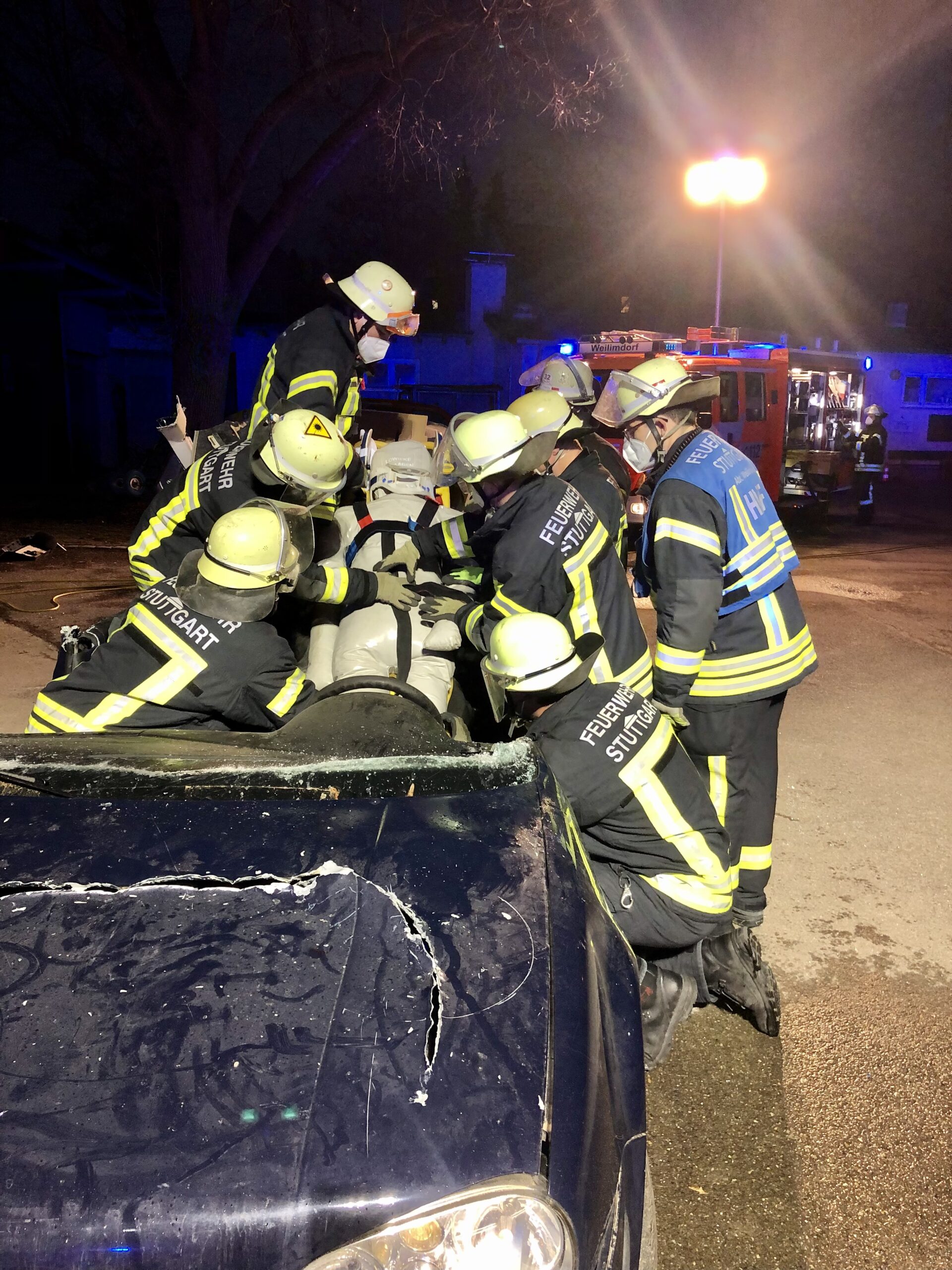 Zu Beginn werden Zugänge zu den Verletzten geschaffen, um lebensrettende Sofortmaßnahmen durchführen zu können. Parallel wird die Einsatzstelle abgesichert. Im Anschluss wird das Unfallfahrzeug gegen sämtliche Bewegungen gesichert. Durch das Unterbauen des PKWs wird ein fester Stand ermöglicht, sodass auch beim Einsatz von Schere oder Spreizer sich das Fahrzeug nicht bewegen kann. Um den schwerverletzen Fahrer möglichst schonend aus dem Fahrzeug zu retten, wurden die Türen und anschließend das Dach des Fahrzeugs entfernt. Nun konnte dieser mithilfe eines Spineboards so schonend wie möglich befreit werden. Im Ernstfall erfolgt nun die Übergabe an den Rettungsdienst und dieser übernimmt die weitere Betreuung.