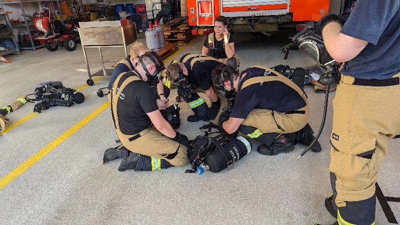 Des weiteren wurden Atemtechniken geübt. Dafür teilten sich mehrere Personen ein Atemschutzgerät. Hierfür kann also immer nur einer Atemluft einatmen, während die anderen die Luft anhalten müssen. Um zu lernen, wie man gegen den Atemreflex ankämpfen kann, ist nur in so einer gesicherten Umgebung möglich. Im Einsatzfall sollte so eine Situation niemals auftreten und wenn, kann man sich mit solchen Übungen auf den Ernstfall vorbereiten.